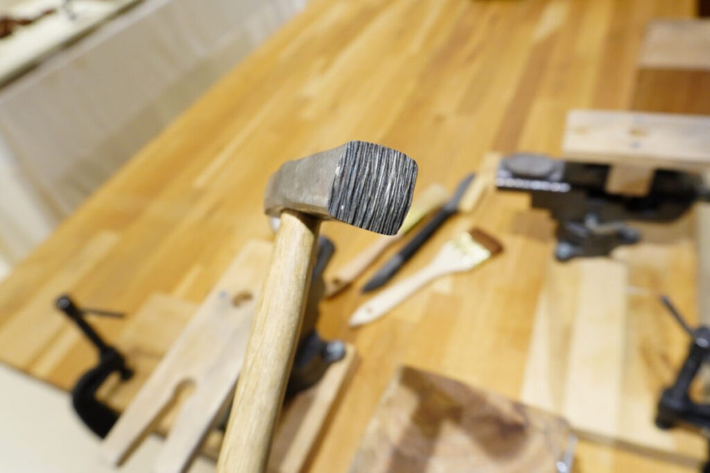 ふたりで仕上げたリングに木目模様のついた金槌をたたきつけて